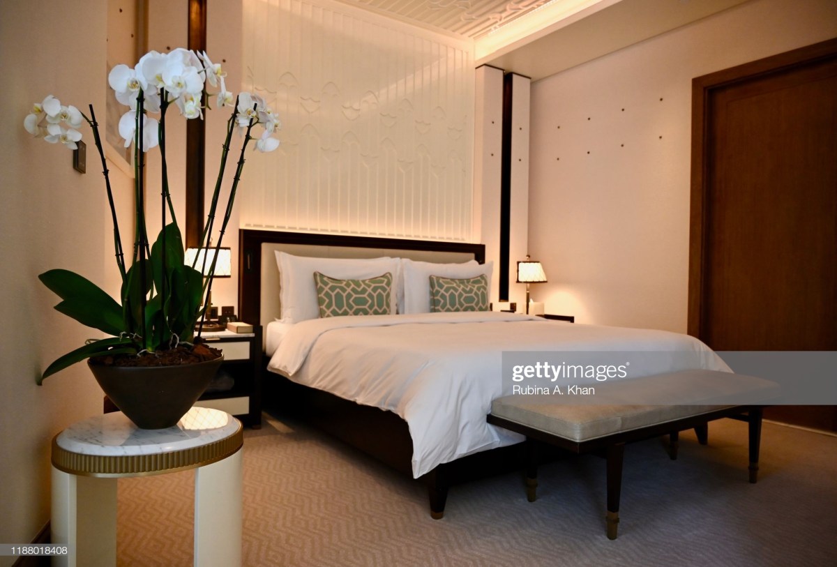 DOHA, QATAR – NOVEMBER 15: A Junior Suite bedroom with the fretwork sand dunes and metallic studs on the walls resembling the old wooden beams in Qatari homes called ‘danshal’ which extend horizontally from walls at the Mandarin Oriental Doha on November 15, 2019 in Doha, Qatar. (Photo by Rubina A. Khan/Getty Images)