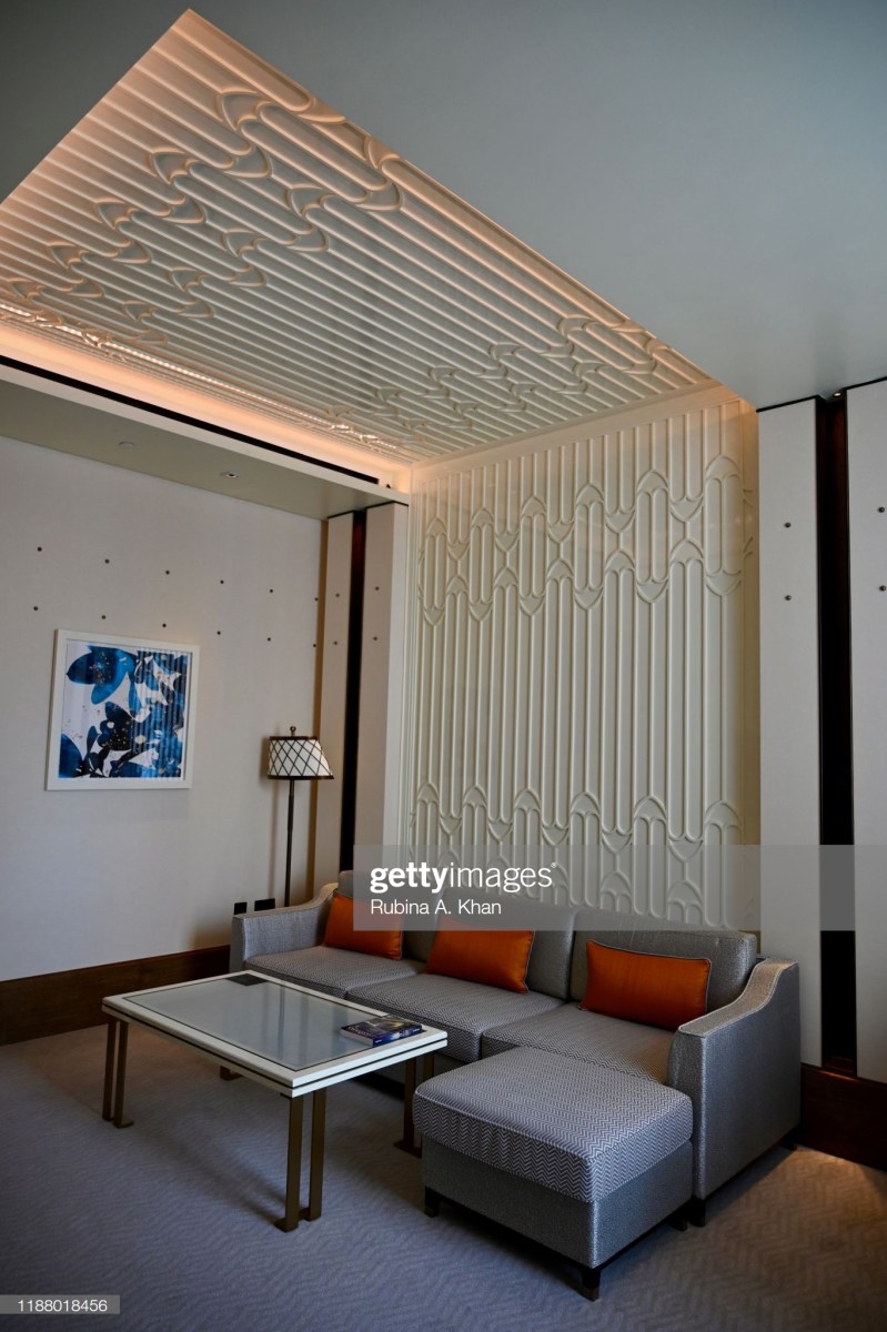 DOHA, QATAR – NOVEMBER 15: A Junior Suite living room with the fretwork sand dunes and metallic studs above the art work on the walls resembling the old wooden beams in Qatari homes called ‘danshal’ which extend horizontally from walls at the Mandarin Oriental Doha on November 15, 2019 in Doha, Qatar. (Photo by Rubina A. Khan/Getty Images)