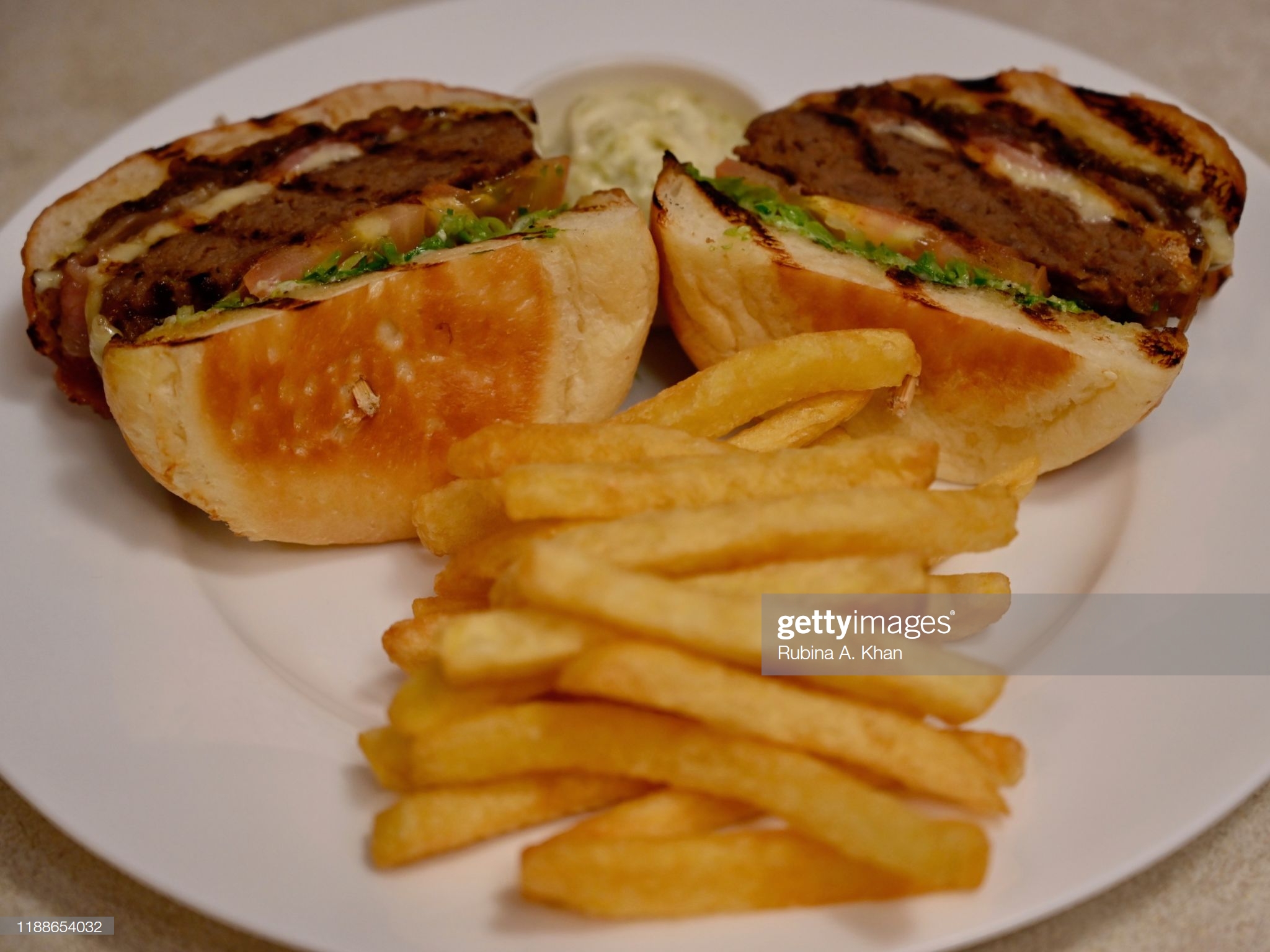 DOHA, QATAR – NOVEMBER 17: A Wagyu Burger with Veal Bacon and Fries at the outdoor terrace at Izu, a Mediterranean cuisine restaurant named after its Nigerian chef, Izu Ani, facing the Barahat Msheireb Town Square at the Mandarin Oriental, Doha on November 17, 2019 in Doha, Qatar. (Photo by Rubina A. Khan/Getty Images)