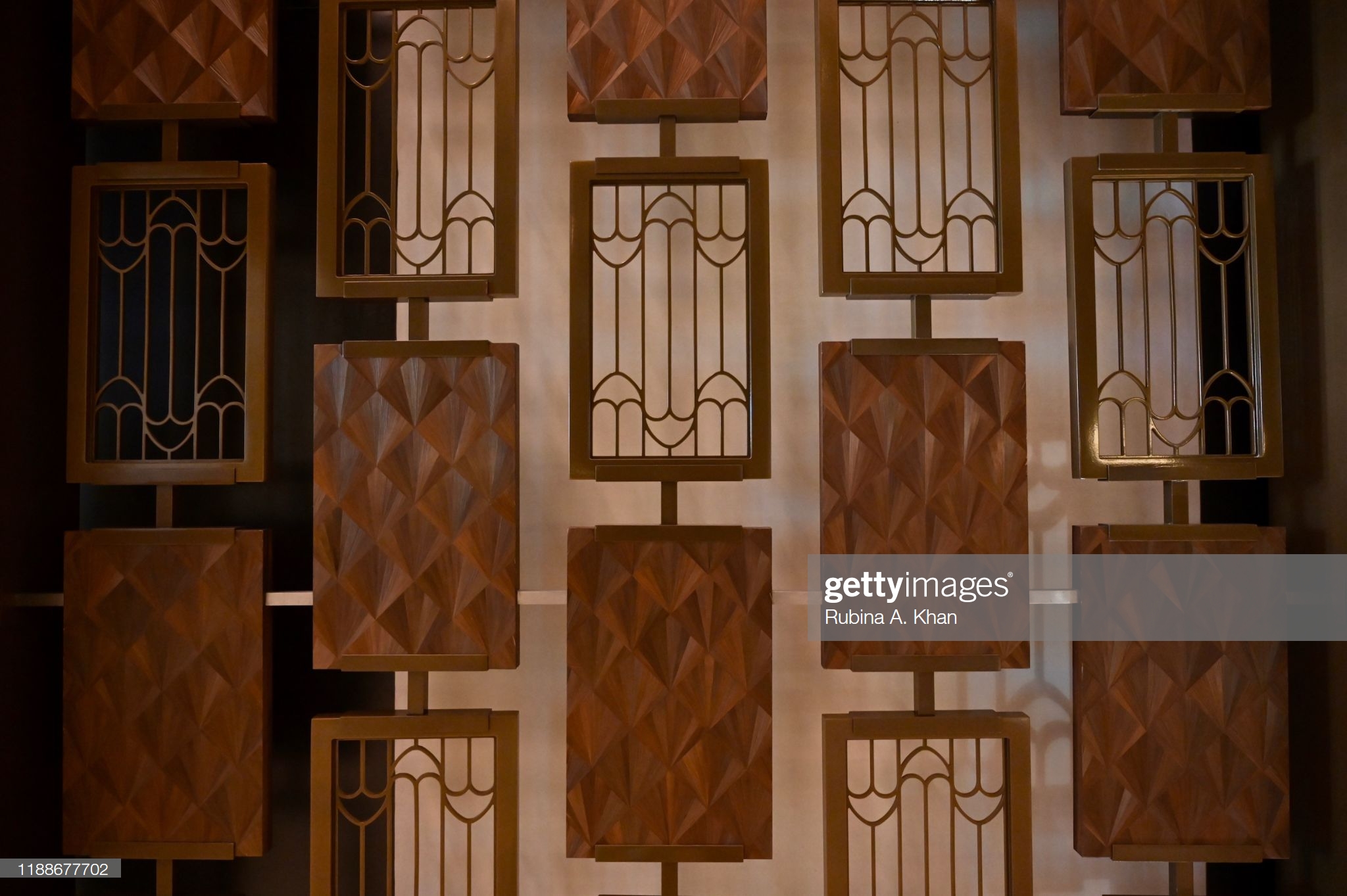 DOHA, QATAR – NOVEMBER 17: A closer view of the brass veil, influenced by the awnings and canopies of Arab dhows and ocean waves, designed by the David Collins Studio and Alexander Lamont’s straw marquetry that adorn the lobby of the Mandarin Oriental, Doha on November 17, 2019 in Doha, Qatar. (Photo by Rubina A. Khan/Getty Images)